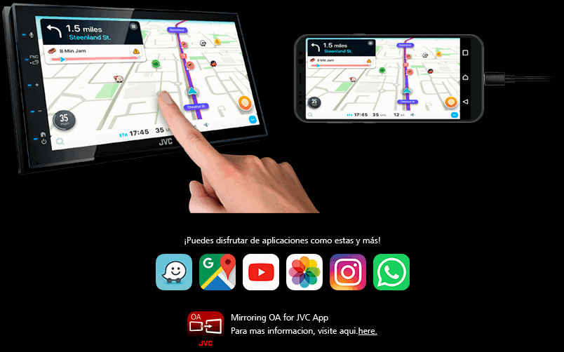 Puede disfrutar de una variedad de aplicaciones como Waze, YouTube e Instagram. El control táctil es posible tanto desde la pantalla como desde el teléfono inteligente.