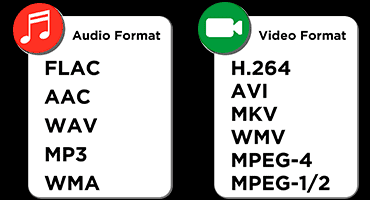Admite una variedad de formatos de archivo para reproducción de audio y video.