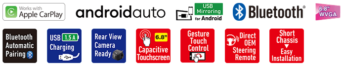 Receptor de medios digitales con monitor táctil capacitivo de 6.8 «/ Apple CarPlay / Android Auto / USB Mirroring para teléfonos Android / Bluetooth® / EQ de 13 bandas / Chasis poco profundo